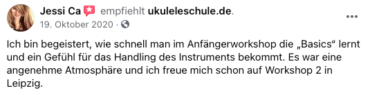 Der ultimative Einstieg in die farbenfrohe Welt der Ukulele.Nach einem Workshop kannst du garantiert die ersten Songs wie Happy Birthday, Amazing Grace, Stand By Me, Don’t Worry Be Happy, Hallelujah, uva. begleiten. Ohne Vorkenntnisse und mit viel Spaß! 10 bis 16 Uhr (inkl. Pausen) inklusive Songbook allgemeine Einführung einfache Strumms in 4/4-, 3/4- und 6/8-Takt (inkl. Island-Strumm & „Shuffeln“) die ersten und wichtigsten Akkordgriffe lesen und verstehen von Rhythmus-Patterns Einführung in Picking-Techniken, sowie Melodiespiel Songs: Frere Jacques, Hejo spann den Wagen an, La Cucaracha, Drunken Sailor, Don’t Worry Be Happy, Blowin‘ In The Wind, Stand By Me, You Are My Sunshine, Happy Birthday, I Follow Rivers, Amazing Grace, Bella Ciao, Ode an die Freude, Joshua Fought The Battle Of Jericho, Hallelujah, Heroes, Let It Be, As Tears Go By … mind. 4 – höchstens 9 TeilnehmerInnen Bitte beachten: Diese Veranstaltung wird von einem Partner von ukuleleschule.de organisiert und durchgeführt. Sie ist aber kompatibel mit dem Akademie-Konzept von ukuleleschule.de. Die Abrechung erfolgt i.A. des Partners ohne Ausweisung der Umsatzteuer.